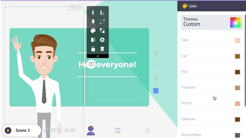 First, let’s learn how to edit the existing character. First, click on the character. Clicking on the character opens the Actions Tab on the right side.You can browse through the 500+ actions in the Actions Tab if you want to change the character's action. Or, you can also search for the action using the search tab. Once you’ve found the action, you can apply it to the character by simply clicking on it. Easy, right?Similarly, if you want to change the character’s expression, browse through the Expressions tab adjacent to the Actions tab or search for the expression using the search tab. Once you find the proper expression from the 20+ expressions available, you can click on the expression to apply it.Apart from changing the character’s action and expression, you can also change its skin tone, hair color, eye color, and color of attire. To do that, click on the character. This opens a small box called the Item Menu with several options. Select the Change Color option from the menu to edit the characters' colors.This opens the Color Tab. From here, you can change the colors of the character.