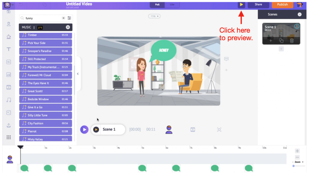 We have come to the end of the actual video-making process. For our cartoon video, we added everything necessary from the characters to the speech bubbles, except for one thing. The comical background music, of course!To add a music track to the video, go to Library -> Music. The library has 30K+ royalty-free music tracks for any and every mood. Search for a music track by entering the keyword in the search tab. To preview it, hover over the track. Then, click on the track to add it to the video.When you click on the track in the timeline, you will see five options appearing. Use them to preview, adjust the volume, trim, duplicate, and delete the track.The most crucial aspect of a video with voiceovers is that the music track shouldn’t overpower the voiceovers added. To avoid that, you can use the Adjust Volume option and reduce the volume of the music track. That’s how you add a music track to your video!