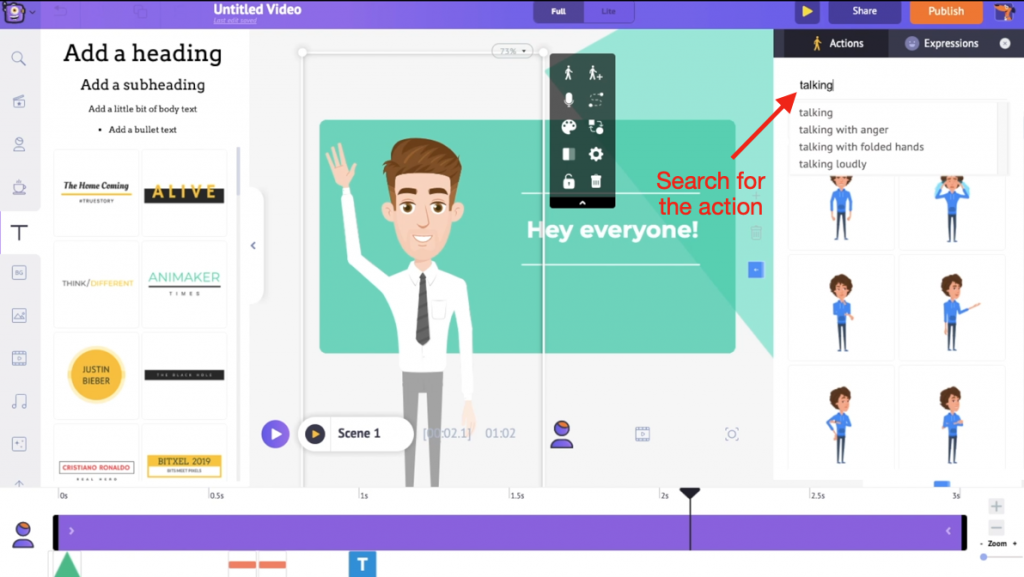 Animaker has a vast collection of characters with varieties like Adults, Kids, Plus-size, Animals, etc. You can choose any by scrolling through the long list of characters.You can add a pre-made character or create a unique one by customizing the various skeletons. Go to Library -> Character to add a character to the workspace. First, let’s learn how to create a unique, customized character. Go to the My Characters sectionunder the Characters Tab. Select the Create your Own button.This opens the Character Builder. Start by selecting the character skeleton and then the basic character template. The character builder has a lot of options to customize your character. For example, you can choose different hairdos, eyebrow shapes and colors, accessories, shoes, masks, clothes, etc. By this, you can create more than a billion characters and create lookalikes.Once you are done customizing the character, select the Save button. This adds the newly customized character to the My Characters section.So, that’s how you create a new custom character. That was easy, wasn’t it?The other way to add characters to your video is to select from the long list of pre-made characters from the Animaker library. Let’s choose two such pre-made characters for our cartoon video.Let’s add the first character.Once the character is added to the library, you will notice the Actions Tab open on the right. This tab has 1000+ actions that you can apply to the character. Adjacent to the Actions Tab is the Expressions Tab, which has 20+ expressions for the character.Let’s make this character sit in the background chair and read a newspaper. To do that, search for the term “reading” in the search bar of the Actions tab. This displays different reading actions. Let’s select the best action and position the character perfectly.It’s time to add the second character to the scene. First, let’s make this character stand and talk. So, as we did for the first character, select the character to open the Actions Tab, search for the action, apply it to the character, and position it in the scene.This is how you can add pre-made characters and also apply actions to it! Easy, right?