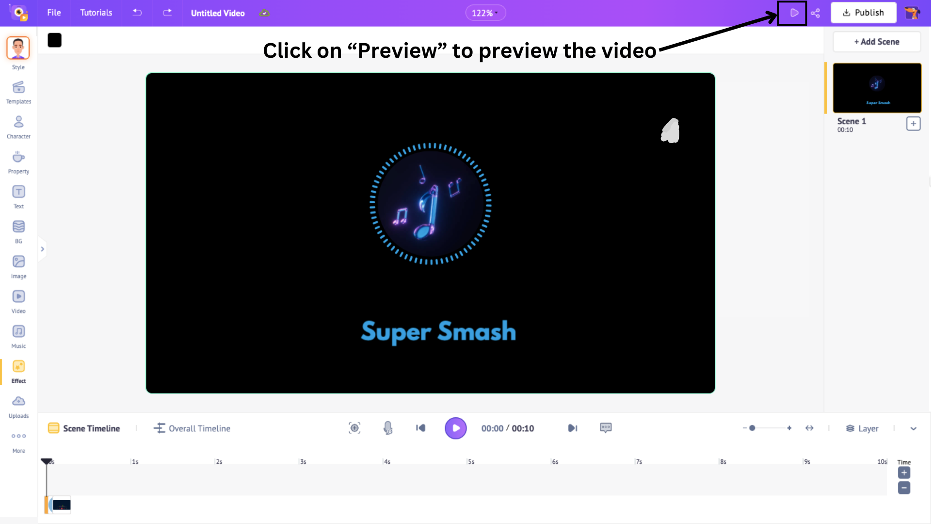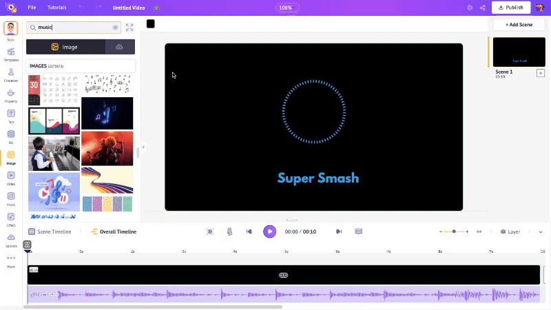 However, since each scene’s default duration is 10 seconds, the audio will initially be trimmed to fit the first 10 seconds. But don’t worry—this is easy to fix!